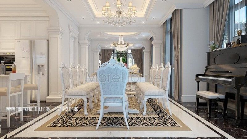 Để không gian phòng ăn cho căn biệt thự của gia chủ trở lên sang trọng thì đừng bỏ lỡ bộ bàn ăn tân cổ điên cao cấp này.