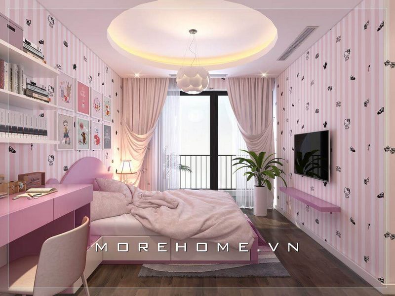 Thiết kế phòng ngủ bé gai đẹp, cửa sổ được bố trí hợp lí kích thước lớn tạo cảm giác cho căn phòng luôn thông thoáng tràn ngập ánh sáng tự nhiên