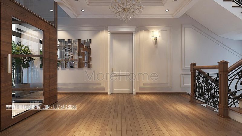 Cửa gỗ tự nhiên đẹp được sử dụng cho phòng khách của biệt thự Đông Anh tại Hà Nội.